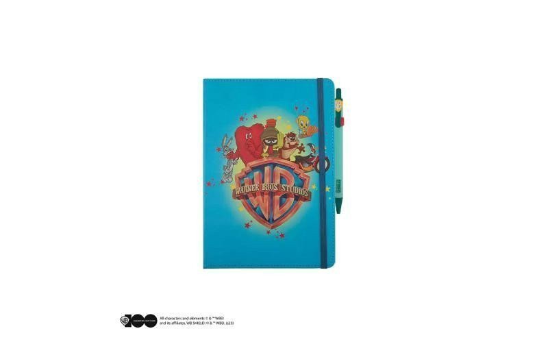 A5-sized notebook and pen featuring Looney Tunes for the 100th anniversary of Warner Bros. It contains alternating lined and blank pages. The cover is pleasant and imitates leather.