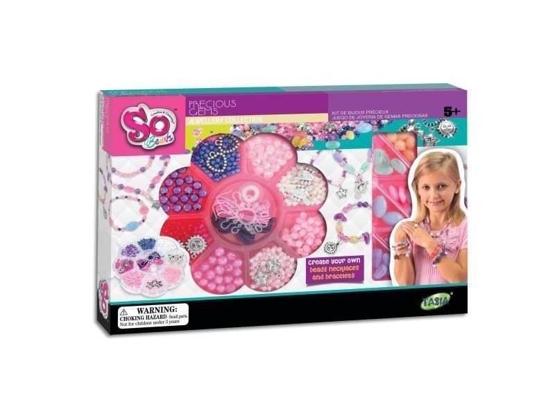The set includes a palette full of beads, unconventional colored stones with holes for threading, silver decorations, a plastic container, threads, and jewelry components.