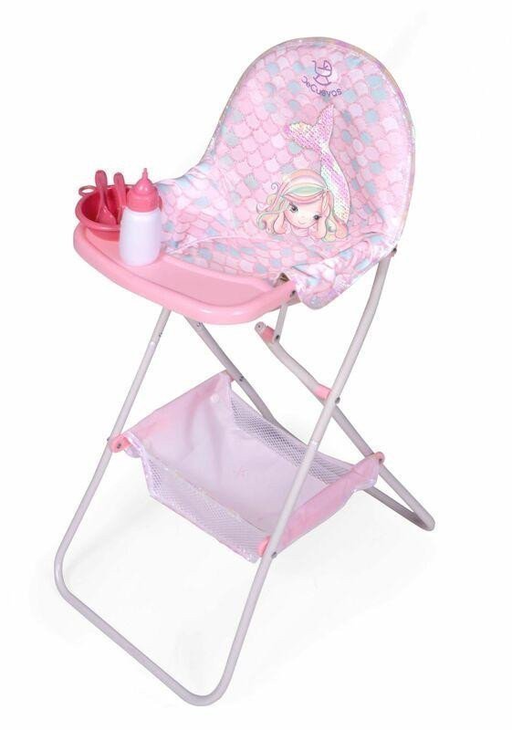 DeCuevas 53241 Folding Doll High Chair with Accessories Ocean Fantasy 2021 is from a beautiful light pink collection featuring a little mermaid. This year's collection is adorned with sparkling, partially color-changing sequins on the mermaid's tail, reminiscent of fish scales. Starfish, cute cushions shaped like a tail fin, and smooth glossy trim that creates rainbow effects complement this sea fairy tale theme. The Ocean Fantasy 2021 collection offers the largest selection of products from travel and dining sets to cribs and strollers, as well as wooden furniture, not just for dolls. Accessories and equipment: • Plastic dining set with a bottle, bowl, and cutlery • Practical fabric storage basket at the bottom • Dimensions of the chair: 42 × 32 cm 65 cm (l x w x h) • Height to the dining table: 50 cm • Doll not included Additional information: • Beautiful Spanish design • Precise craftsmanship • Folding model • Very easy to handle during play • Material: metal, plastic, textile • Packaged in a box in the colors of the collection • Packaging dimensions: 43 x 8 x 32 cm (l x w x h) • Packaging weight: 1.44 kg • Selected models feature a QR code on the packaging with a video assembly guide • Recommended age from 3 years