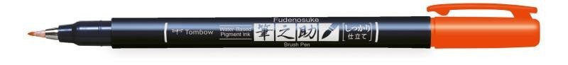 Fix Fudenosuke (brush pen) with an elastic brush tip (hard type). The line varies from thin to thick depending on the pressure applied to the tip. The Fix Fudenosuke with a hard tip is particularly suitable for writing small letters. Ideal for calligraphy, handwritten signs, sketching, doodling, and much more. The ink is water-based and odorless. Ink color: orange.