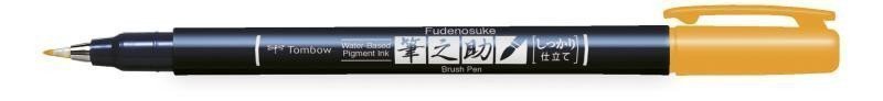 The Fudenosuke pen (brush pen) with a flexible brush tip (hard type). The line varies from thin to thick depending on the pressure applied to the tip. The hard tip Fudenosuke pen is particularly suitable for writing small letters. Ideal for calligraphy, handwritten signs, sketch noting, doodling, and much more. The ink is water-based and odorless. Ink color: yellow.