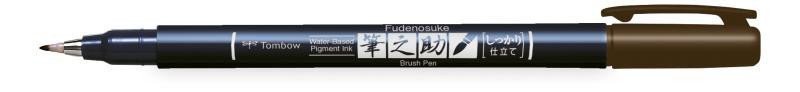Fix Fudenosuke (brush pen) with an elastic brush tip (hard type). The line varies from thin to thick depending on the pressure applied to the tip. The Fix Fudenosuke with a hard tip is particularly suitable for writing small letters. Ideal for calligraphy, handwritten signs, sketching, doodling, and much more. The ink is water-based and odorless. Ink color: brown.
