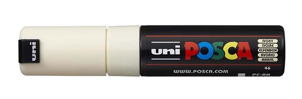 The effective marker with a wide chiseled tip allows for drawing neat curves and covering large areas. Available in an interesting range of colors. Ideal for shading, street art drawings; suitable for beginners and professionals alike. Line thickness: 8 mm wide, tip: acrylic/chiseled, body: plastic (PP), color range: 17 including metallics. It contains an unparalleled ink whose composition has not changed since its creation, is exceptionally rich in pigments, and is extremely resistant to atmospheric conditions and the passage of time. Its matte colors have great depth - artists love them for their works, and fans are amazed by the 'magical' effect of Posca. It features a unique valve mechanism that ensures perfect sealing and preserves the ink over time. The same mechanism is used to refill Posca markers for use and to re-saturate the tip as often as necessary during creation. The ink is very rich in pigments, resulting in outstanding density. Its unique water-based formula provides bright, matte, opaque colors that truly last. It is odorless. The colors are layerable, mixable, water-soluble, weather-resistant, and offer unlimited creative possibilities. Made in Japan.