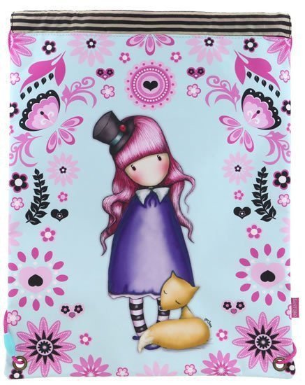 The doll that adorns it has pink hair with a hat, a purple dress, and a fox lying at her feet. The background is in a blue-green shade filled with flowers. The bag is suitable not only for slippers but also for physical education and sports. You can tighten the bag using the strings and carry it on your back or shoulder. Maintaining the bag is very easy; you only need a damp cloth.