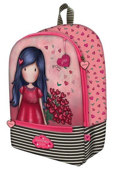 This school backpack has a total of two compartments, which have only one main space. The back compartment has a reinforced bottom, two sewn pockets for items like a mobile phone, and one zippered pocket. Both compartments close with a two-way zipper. All zippers are adorned with a charm. The back of the backpack is padded, as are the adjustable straps. There is also another zippered pocket on the front. The Gorjuss doll is depicted on a glittery fabric. Dimensions: 32 x 45 x 13.5 cm.