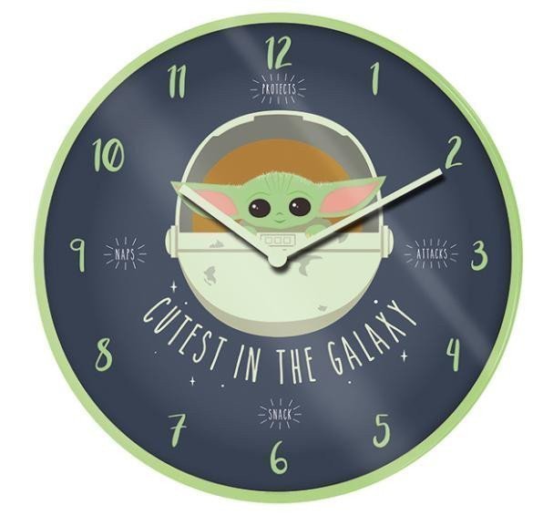 Star Wars Wall Clock: Mandalorian - Cutest In The Galaxy for fans of The Mandalorian and Star Wars for fans of Baby Yoda powered by: 1x AA battery (not included) officially licensed product. Let the cutest child in the galaxy, Baby Yoda from the series The Mandalorian, keep track of time for you! This nice wall clock will delight Star Wars fans, the sci-fi saga Star Wars. Product details Parameters Height: 25.4 cm Width: 25.4 cm Length: 2 cm Material: plastic