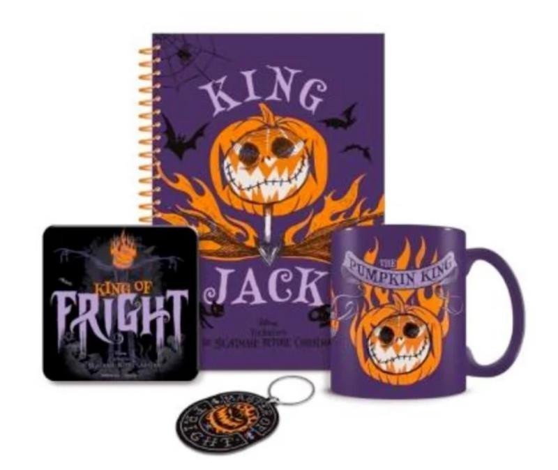 A limited gift set featuring licensed designs from the animated musical Nightmare Before Christmas. The set includes a mug, a coaster, an A5 lined notebook, and a keychain.