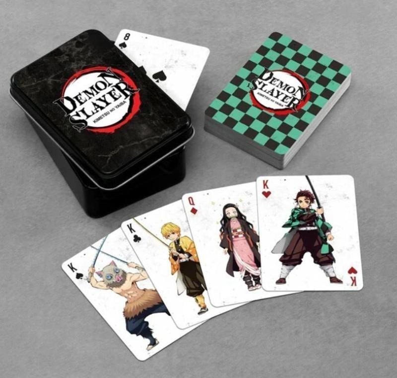 Play your favorite card game with the heroes from the Japanese manga Demon Slayer. Beautiful playing cards will delight loyal fans. They are stored in a metal box. Contains 52 cards + 2 jokers.