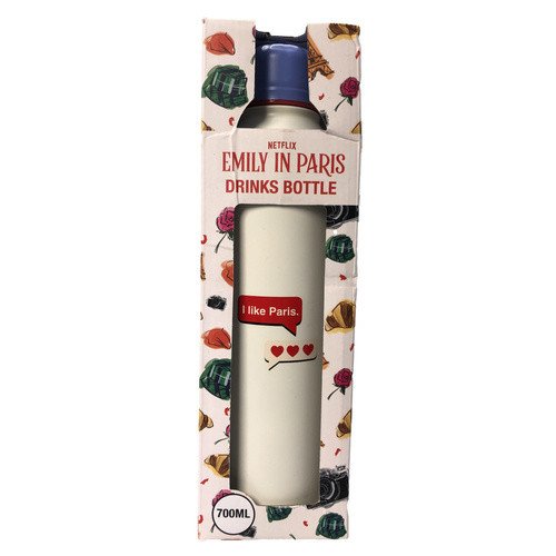 Stainless steel bottle with a capacity of 700 ml featuring a licensed design from the series Emily in Paris. The bottle is not suitable for dishwashers or microwaves.