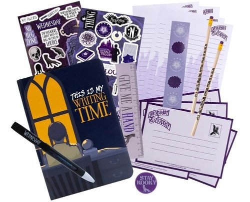 The gift box contains a storage box, A5 notebook, pen, 7 sheets of stickers, 2 pencils, 12 sheets of letter paper, erasers, 6 envelopes, and a ruler.