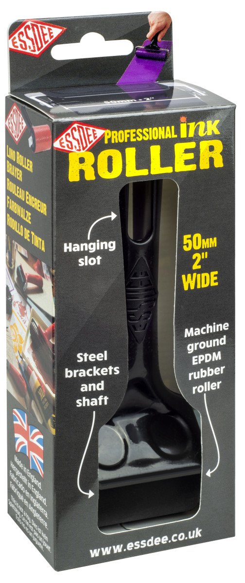 Professional roller. This professional high-weight roller helps artists repeatedly achieve perfect printing results. This roller, made of medium-hard (60 shore) machine-ground EPDM rubber with a circumference of 122 mm, holds a larger amount of ink and offers better capturing and transfer. Greater ink coverage is especially useful for larger printing blocks and allows for smooth, consistent, and precise printing.