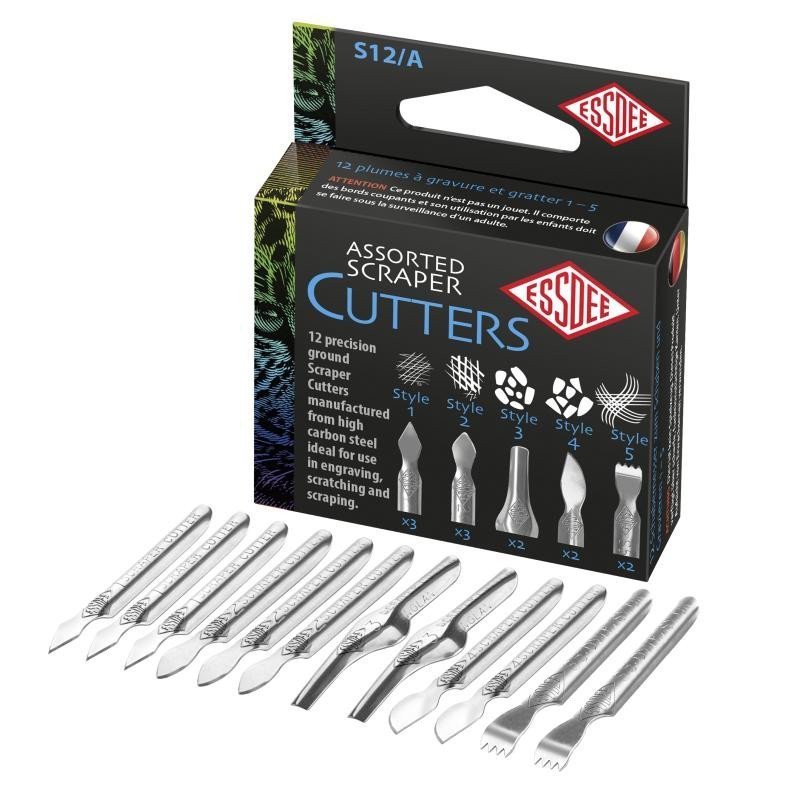 Carbon steel scrapers, hardened and tempered to maximum limits for long life. Jig-ground to ensure optimal scraping edge. This set includes 12 different scrapers in styles 1 to 5.