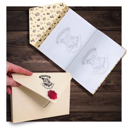 A premium A5-sized lined notebook in the shape of an envelope. Officially licensed - Harry Potter.