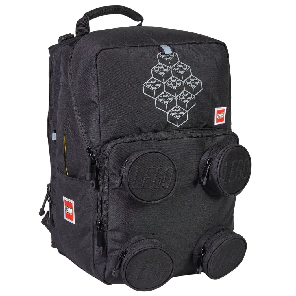The Petersen school bag features a front pocket shaped like a miniature 2x2 LEGO brick. The ergonomic back panel made of breathable mesh with an adjustable height system ensures optimal fit. The shoulder, chest, and lifting straps provide maximum comfort and body adherence. The internal layout includes an elastic strap for books, a compartment for a laptop or heavy folders, and a deep front pocket ideal for snacks. Round zippered pockets are suitable for a mobile phone or long pencils, while the side pocket for a bottle ensures practical storage. Safety is enhanced by reflective elements on all sides, while the sturdy waterproof bottom protects the contents and makes cleaning easier.