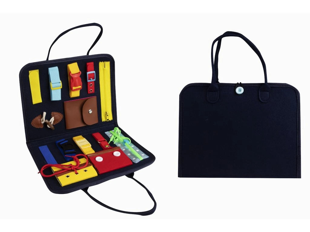 Textile sensory book with accessories.