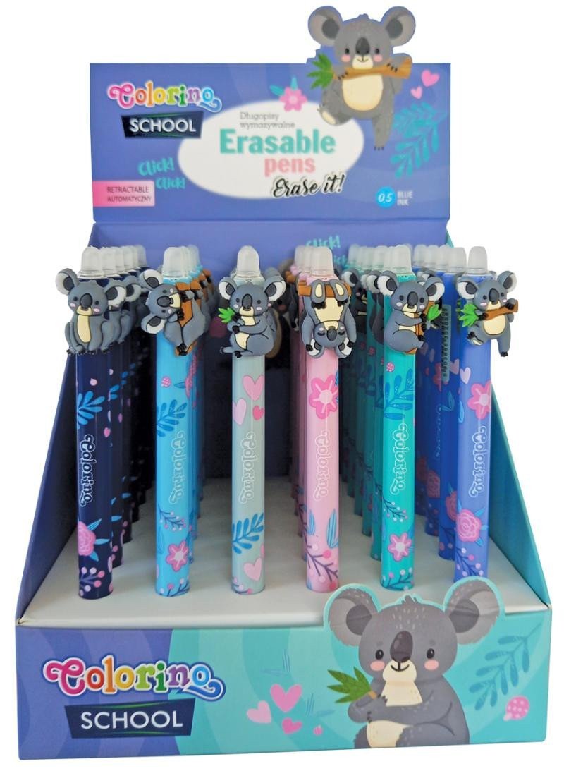 Practical erasable pens for children featuring cute koala motifs. The quality ink can easily be erased and rewritten if needed. 6 different designs, ink color: blue, line width: 0.5 mm, push mechanism, available replacement ink.