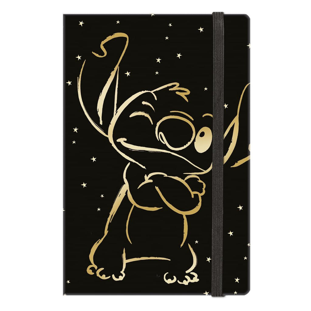 Notebook with hard covers, featuring a flat fixing rubber band. Suitable for everyday notes, daily tasks, or as a diary. Lined white paper with a small Stitch decoration in the bottom right corner.