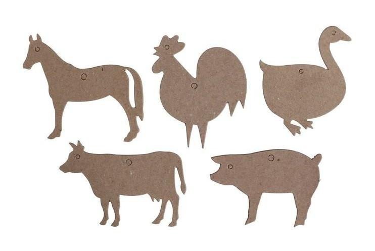 The set of cardboard cutouts in the shape of farm animals. After decorating, you can hang your creations as part of the decoration or stick them on a skewer and play theater with the animals. Shapes: farm animals - cow, pig, horse, rooster, and goose Size: approx. 6x10 cm, cardboard thickness 2 mm Quantity in the package: 5 pcs