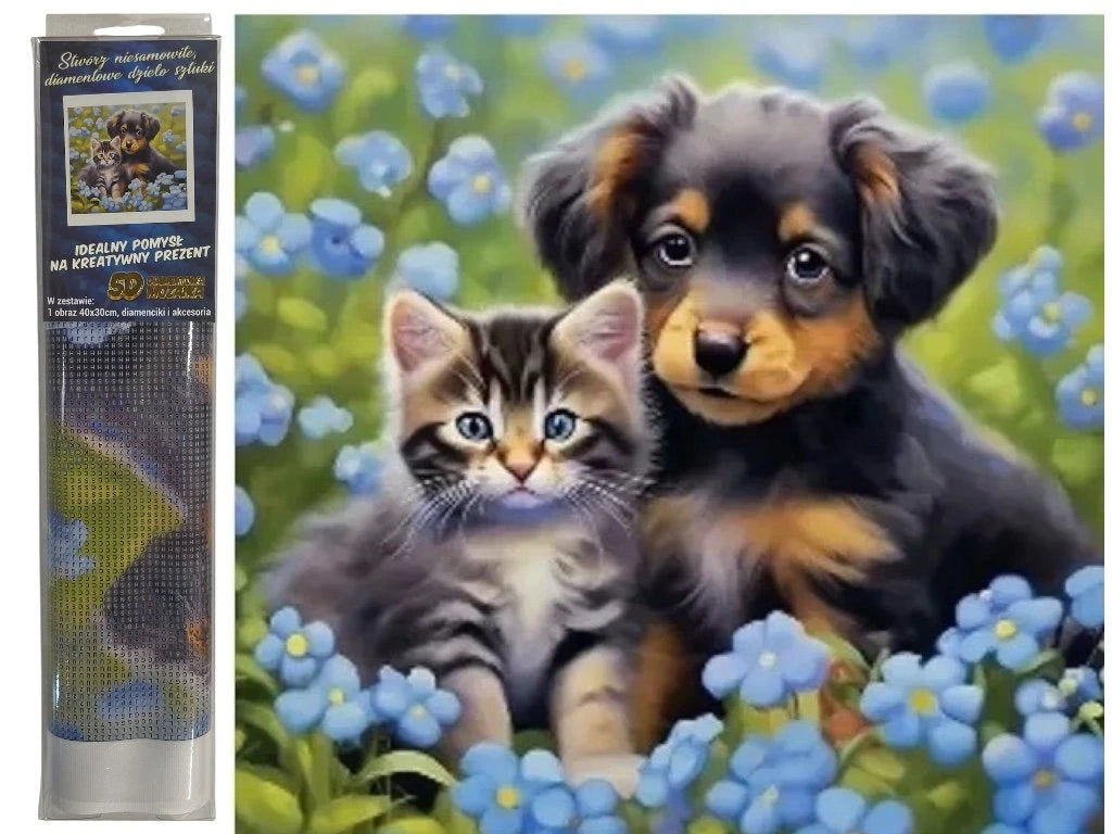 Diamantový obrázek - Kočička a pejsek v pomněnkách 30 x 40 cm