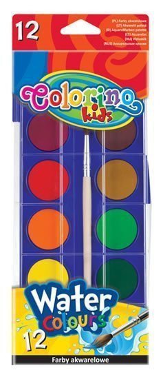 Quality watercolors with a high pigment content. They do not crack upon repeated use. Practical plastic case with a round brush. Case dimensions: 21 x 9 cm. Suitable for children aged 3 and up. The colors are non-toxic. Packaging: 12 colors + brush/case.