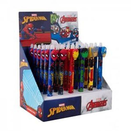 Favorite practical pens with a push mechanism for schoolchildren - writing text without rewriting. Just erase the written text and easily write a new one. Spiderman and Avengers motifs in a colorful mix. Ink color: blue.