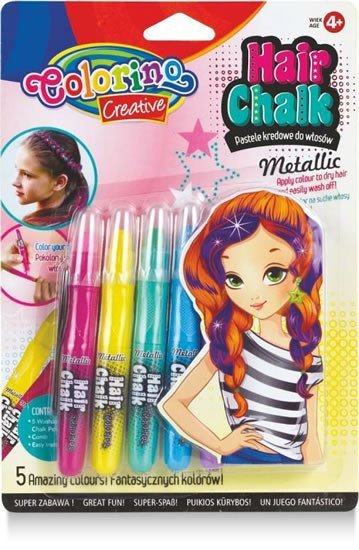 Sparkling pen colors strands of hair. Apply color to a selected strand of dry hair and comb through with a small comb. The color can be easily washed out with hair shampoo. The packaging contains 5 metallic colors (5x 6 g) and a mini comb.