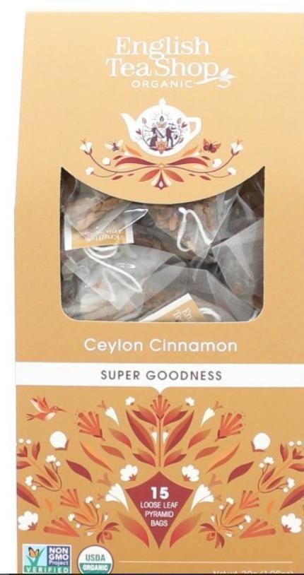 The Spiced Ceylon Cinnamon tea in organic quality from English Tea Shop has a spicy and aromatic flavor. The combination of cinnamon, ginger, and cardamom will surprise you with its unmistakable taste. The tea is completely caffeine-free. Cinnamon has warming effects and helps regenerate the skin. Its aroma has aphrodisiac effects. Ginger has a spicy taste and is known for its antibacterial properties. Cardamom has a strong aroma and woody flavor. Ingredients: cinnamon (90%)*, ginger (6%)*, cardamom (4%)* *Organic Weight: 30 g The package contains 15 pyramids.
