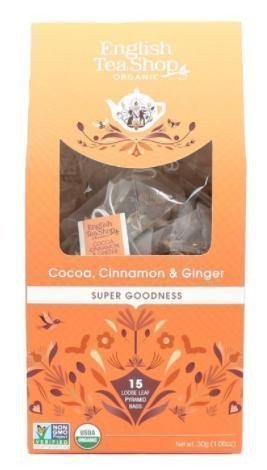 The Cocoa, Cinnamon, and Ginger tea in organic quality from English Tea Shop has a spicy, aromatic, and sweet flavor. Thanks to the practical packaging, you can enjoy the tea anywhere and anytime. The tea is completely caffeine-free. Cinnamon has warming effects and helps regenerate the skin. Cocoa strengthens the body and acts as an aphrodisiac. Fennel refreshes the breath. Ginger is a pleasant addition to the blend thanks to its spicy taste. Ingredients: cinnamon (45%)*, cocoa (35%)*, fennel (15%)*, ginger (5%)* *Organic Weight: 30 g The package contains 15 pyramids.