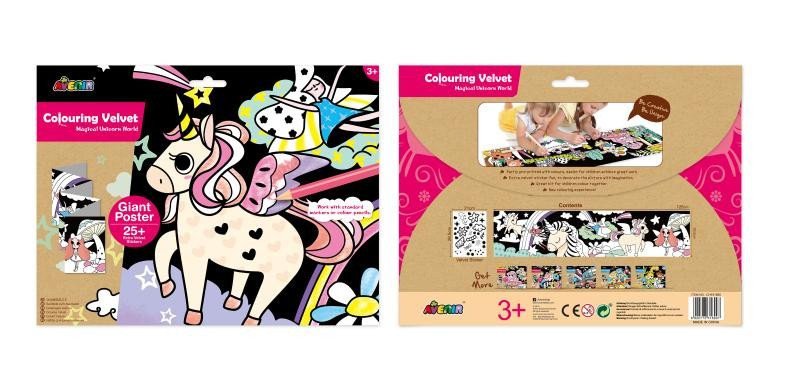 The colorful velvet poster is a wonderful long banner measuring 126 cm x 29.5 cm. The banner is partially pre-printed in color and contains white areas where children can color. The set comes with over 25 velvet stickers that create a masterpiece. 126 cm x 29.5 cm Age 3+