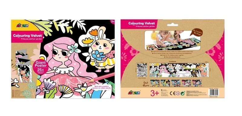 The colorful velvet poster is a wonderful long banner measuring 126 cm x 29.5 cm. The banner is partially pre-printed in color and contains white areas where children can color. The set comes with over 25 velvet stickers that create a masterpiece. 126 cm x 29.5 cm Age 3+