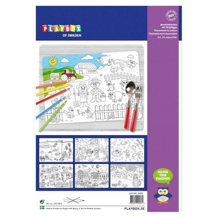 Color your own paper placemats. Contains 6 different designs (a total of 24 pieces). The papers are A3 size. Crayons are not included.