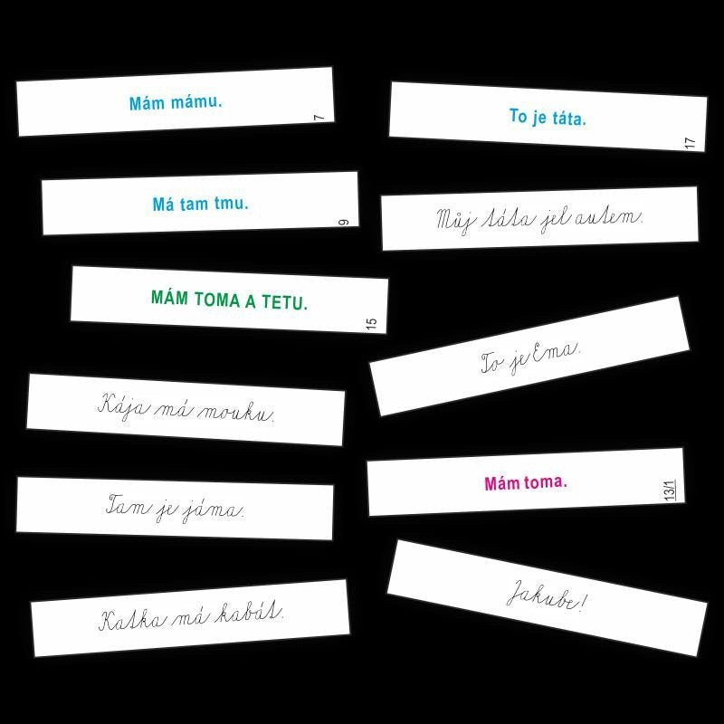 The tool Writing Script corresponds with the writing books for the 1st grade. On one side of the card, there is a sentence written in print. On the other side, there is a sentence written in cursive - for self-checking. The set also includes cards intended for working with errors. The set is divided into 20 parts with 16 sentences each. In each part, a group of new letters is added to the sentences. The tool also includes Writing Script - cards (20 pieces) intended for recording assessment of sentence copying. We recommend the Writing Script - workbook to accompany this tool.