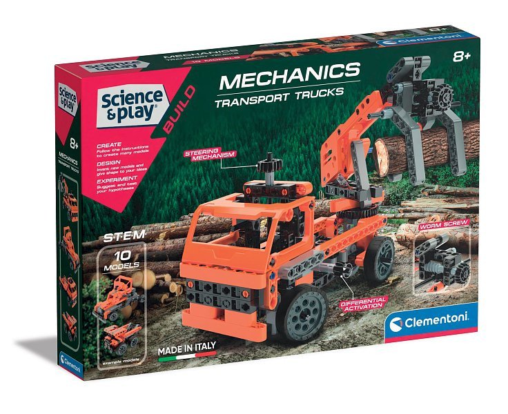 An incredible new mechanical set that will help you understand how large transport vehicles work and get in touch with the principles of mechanics and engineering. Including over 200 parts, with a differential, gears, rods, panels, and many more, to construct 10 fantastic moving models: from trucks with real steering and a handle for transporting a tree trunk. A comprehensive illustrated manual guides the child step by step in building the models and teaches the basics of mechanics, engineering, and how levers and gears work.