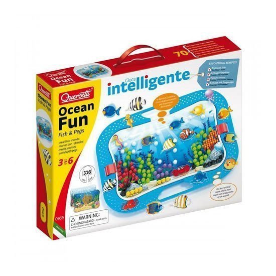 Create your underwater world from pegs! Classic Quercetti pegs in a colorful version representing the world beneath the sea. The set includes pegs of various colors and diameters, which can be inserted to complete the scenery of the ocean floor, along with plenty of stickers and figures of fish, seahorses, crabs, and other creatures to populate your underwater world. Contents: 1 perforated base 28 × 20 cm 2 pattern pictures 300 pegs in 6 different colors 16 figures 1 stand with a holder 1 wooden piercing pen