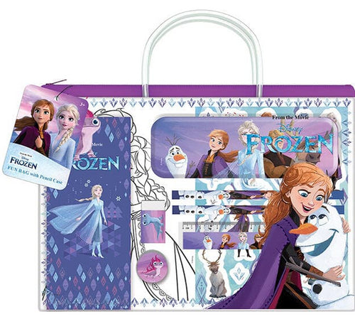 The set includes a metal pencil case, 6 coloring sheets, 2 sticker sheets, 2 pencils, a notebook, a ruler, a sharpener, and an eraser, all in a practical zippered pouch.