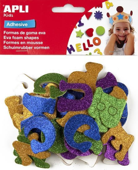 APLI pěnovka tvary - abeceda se třpytkami samolepicí, mix velikostí barev 52 ks