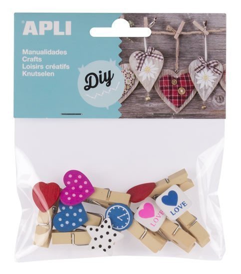 Wooden clips with shape accessories in various colors. Material: wood. Dimensions: 15-20mm accessory, 35mm clip. Suitable for making decorations, creative and educational activities. Suitable for children aged 3 and up. Packaging: 8 pieces.