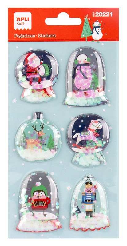 Soft Christmas stickers with permanent adhesive. Inflated shape with glitter inside that shifts when moved. Highly engaging, 6 stickers in the package.