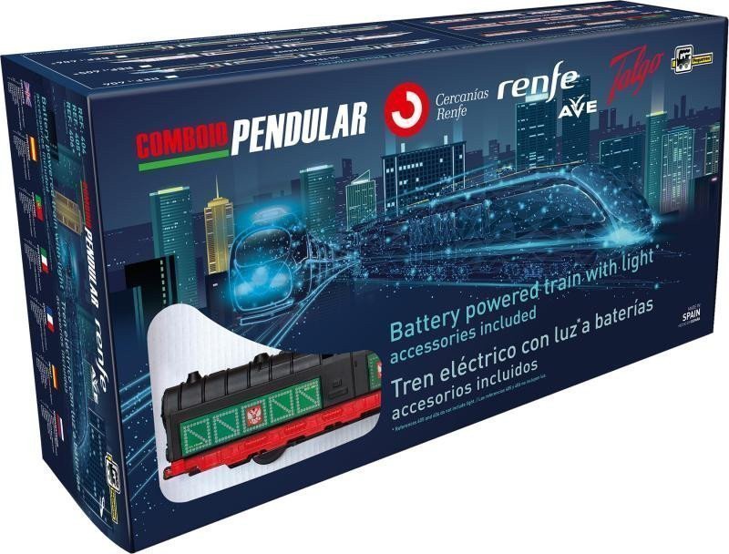 A metal battery-powered passenger train consisting of a locomotive with light and three wagons, running on a track 3.9 m long. The set also includes a station, a signal, and a track switcher – a tool for easier placement of the train on the track. ***** Package contents: * 1 locomotive with light * 3 wagons * 3 straight tracks * 12 curved tracks * 1 station * 1 signal * 1 track switcher ***** Requires 2 batteries 1.5 V (type AA – LR6-M), BATTERIES NOT INCLUDED.