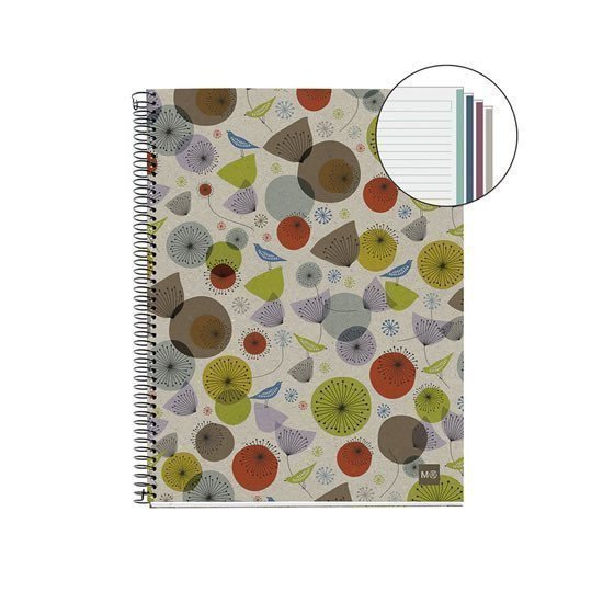 Eco-friendly notepad made from recycled paper in a sturdy cardboard cover with spiral binding. Natural unbleached paper 80 g, 120 sheets. Highlighted header, hole punching for binder insertion, micro-perforation for easy sheet tearing. 100% recycled, Blue Angel certificate, EU Ecolabel, and FSC. Pages differentiated into four colors. Format: A5. Inner sheets: lined.