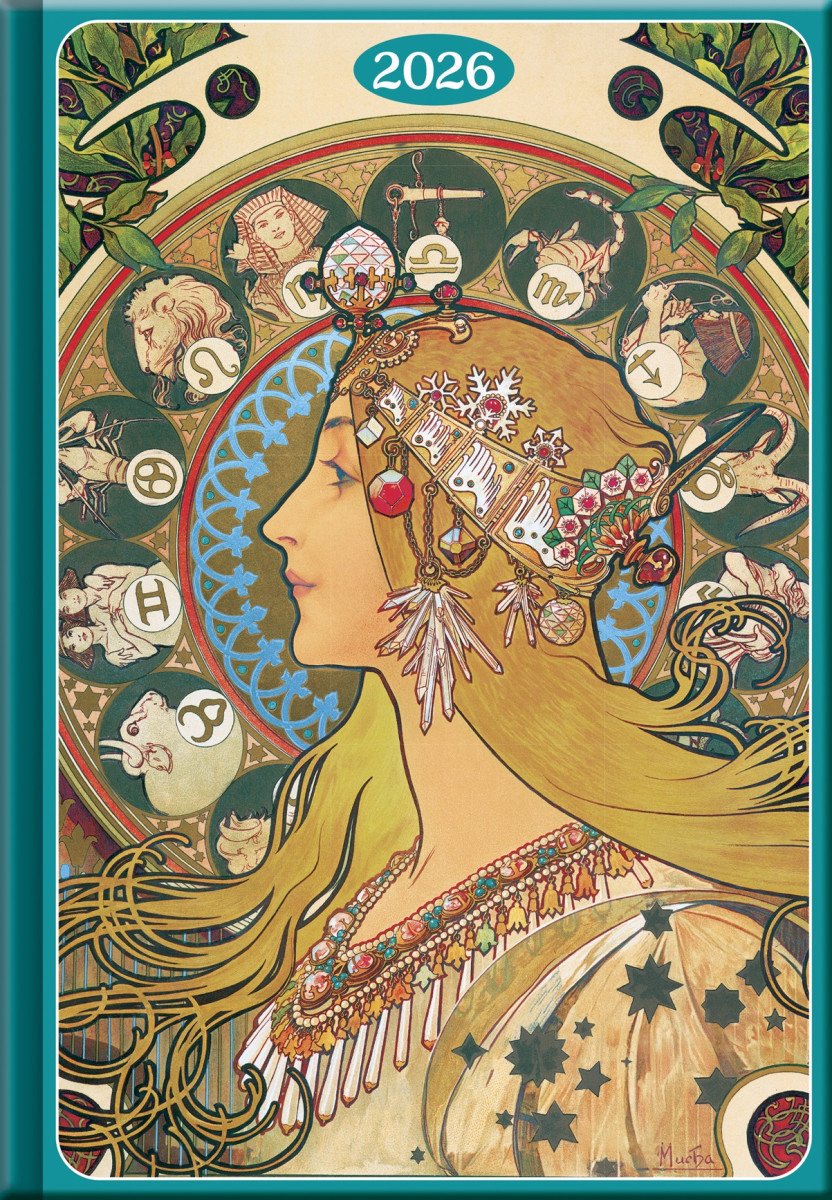 A weekly diary with a cover inspired by the style of Alphonse Mucha that captivates at first glance with its artistic design and high-quality gold embossing. The internal calendar, clearly laid out across two pages, provides ample space for notes, event planning, and daily tasks. Ideal for those seeking a combination of elegance, practicality, and artistic spirit.