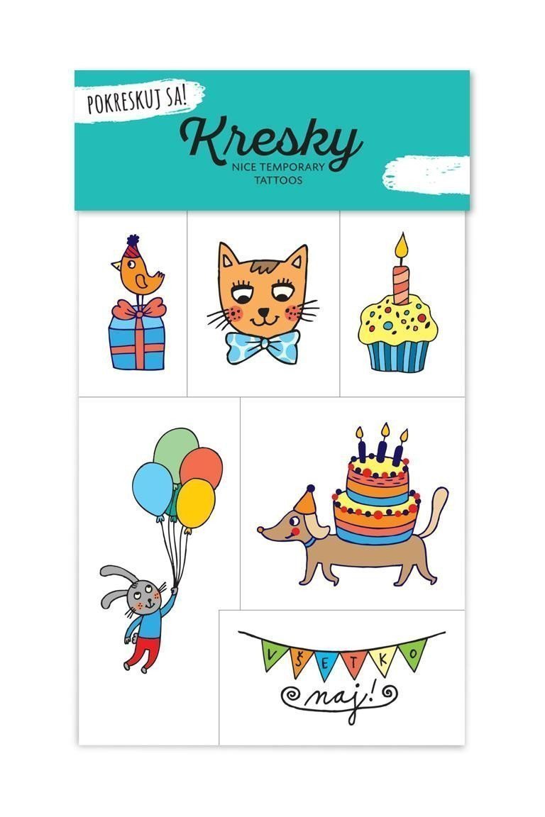 Everyone hands up! Fun Kresky suitable for any celebration. The perfect party that you'll remember for days after it's over, every time you find a tattoo of a dachshund with a cake on its back on your hand. Do not apply temporary tattoos on sensitive skin, near the eyes, or in case of allergies. Dermatologically tested, safe for children.