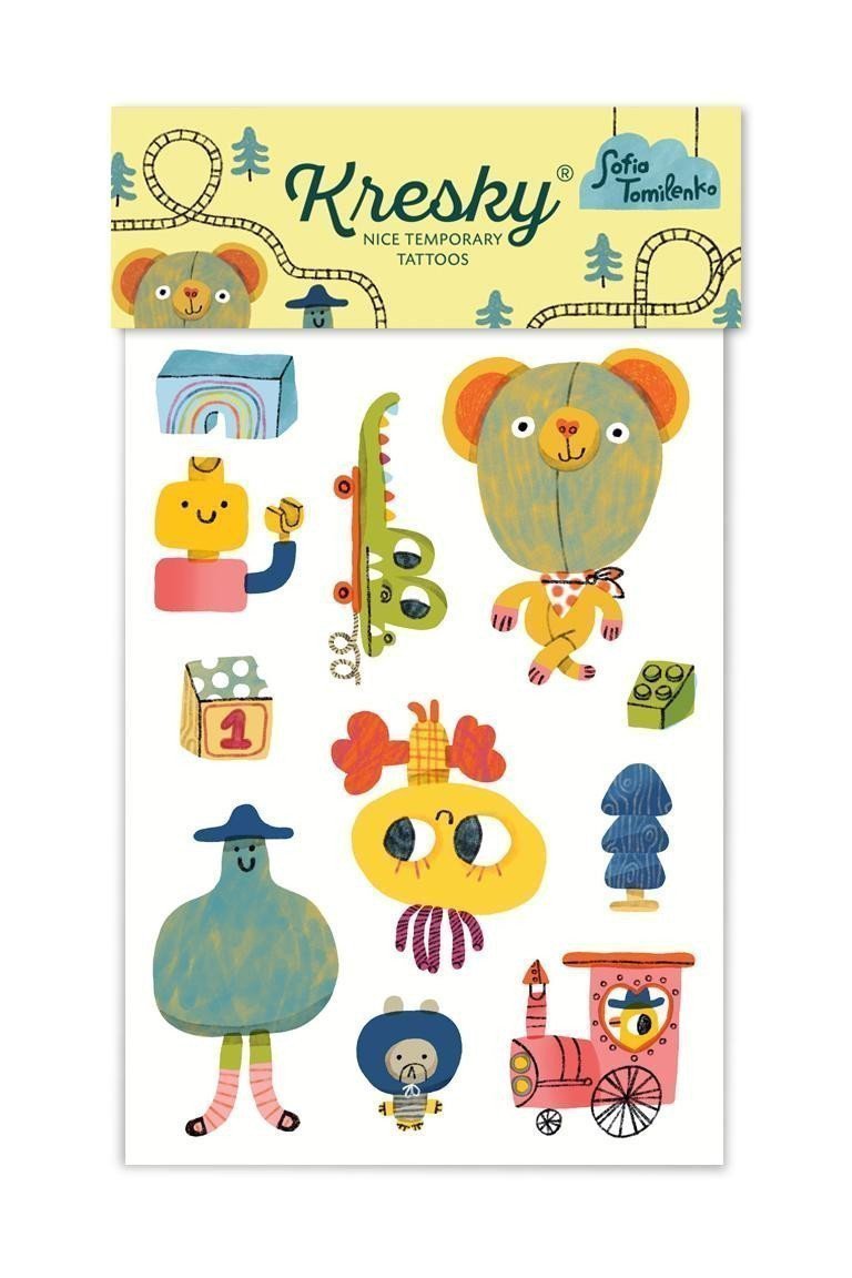The set of tattoos featuring children's toys was illustrated by Ukrainian illustrator Sofia Tomilenko. She chose iconic toys that we played with as children, and that every current child knows. Wooden puzzles, a train, a pull-along crocodile, and a plush toy in which every child sees something different. Do not apply temporary tattoos on sensitive skin, near the eyes, or in case of allergies. Dermatologically tested, safe for children.