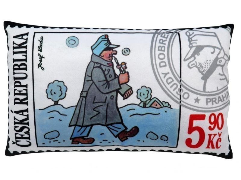 Soft pillow featuring the good soldier Švejk by Josef Lada, suitable for travel and as decoration. Material: microvelour, image print, filling: hollow fiber. Washable. Wash at 30°C, 100% polyester. Made in the Czech Republic.