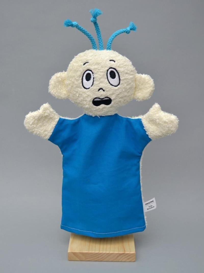 Textile puppet representing the emotion of fear, suitable for psychological counseling, special educators, teachers in kindergartens and children's groups, as well as for home play. Made from natural materials. The face is embroidered, the heads are softly stuffed, and the entire puppet is very pleasant to the touch. Washable. Size approximately 30cm. Certified as a toy (EN71). Handmade in the Czech Republic.