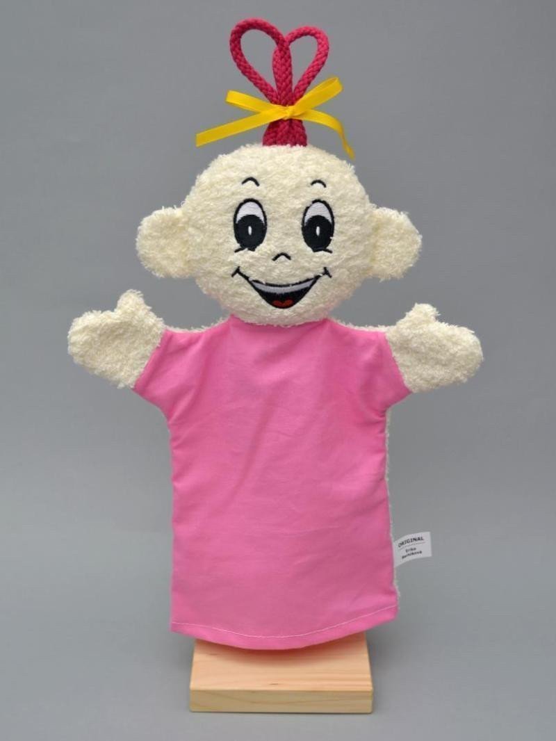 Textile puppet representing the emotion of joy, suitable for psychological counseling, special educators, teachers in kindergartens and children's groups, as well as for home play. Made from natural materials. The face is embroidered, the heads are softly stuffed, and the entire puppet is very pleasant to the touch. Washable. Size approximately 30cm. Certified as a toy (EN71). Handcrafted in the Czech Republic.