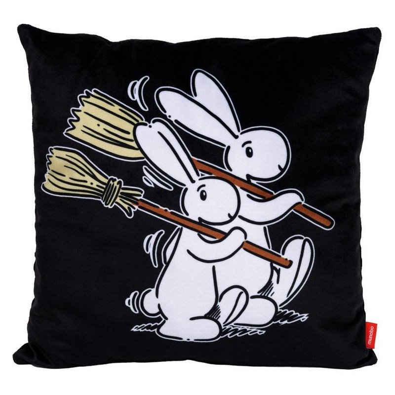 A soft pillow featuring rabbits from Bob and Bobek's hat. Suitable for cribs, travel, or as a decoration in a children's room. Made of microvelour, printed image, filled with hollow fiber. Washable at 30°C, 100% polyester. Handmade in the Czech Republic.