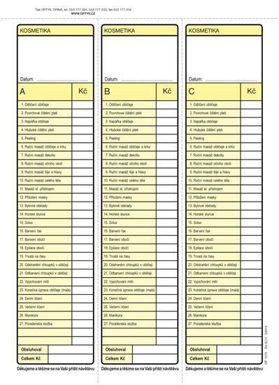 Block for beauty studios with a carbon (self-carbonless) layer, 100 sheets, each sheet has three parts, A5 format, unnumbered. Format: A5 Self-carbonless: Yes Numbered: No Number of sheets: 100