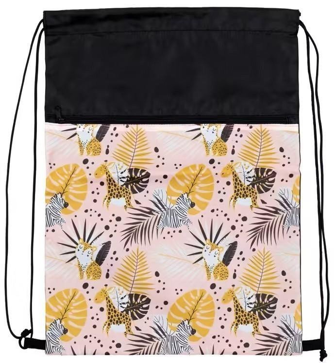 School bag for slippers and gym shoes suitable for 1st grade elementary school students. The school bag is made of durable and high-quality material. Bag dimensions are 440 x 320 mm. The water-repellent sturdy material keeps items dry. The zip pocket separates shoes from other clothing. The drawstring connected to the bottom transforms the bag into a small backpack. The school bag is a practical accessory for a school backpack for storing gym shoes or PE items.