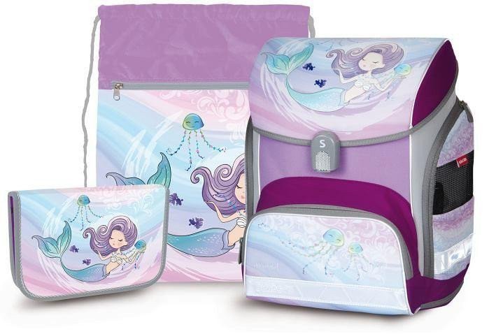 The school set includes: 1. School bag - quality, ergonomically shaped lightweight school bag equipped with reflective elements and anatomically shaped back with a sturdy construction. 2. One-tier empty pencil case with two flaps, measuring 19.5 cm wide x 3.5 cm high x 13 cm deep. 3. School bag for gym shoes suitable for 1st grade primary school students made from durable, quality material. Dimensions of the shoe bag 44 x 32 cm.